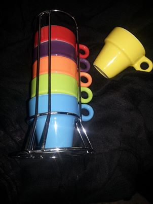Es sind wunderschöne Espresso Tassen in Regenbogenfarben. Ein Blickfang in jeder Küche.
